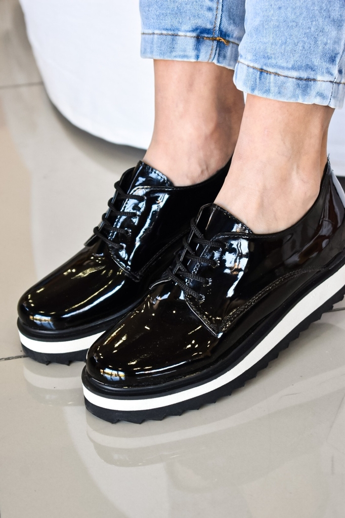 Mocasines de material acharolado, disponibles en rosa y negro. Con detalle blanco en la plataforma. Cordones finos con facil manejo al atar.